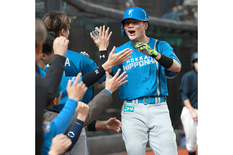 西武先発・今井の前に第1打席は空振り三振、第2打席は中飛に倒れていた。しかし0-0の7回無死の第3打席だった。初球の151キロ、低めの直球を完璧に捉えた。打った瞬間にそれとわかる打球は、清宮幸らしい美しい弧を描いて右翼席中段まで到達した。今井は思わず両膝に手をついてがっくりとうなだれた。ベンチの新庄監督はグータッチならぬ“小指タッチ”で出迎えた。