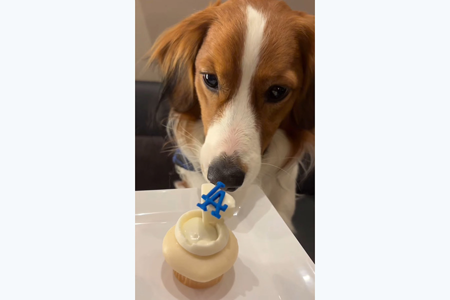デコピンはLAの文字が添えられたカップケーキをペロペロと舐め、つぶらな瞳を見せている。4本目には試合後に行われたドローンアートの様子を公開。デコピンを抱えた大谷と、日本語で「大谷とデコピン」との文字が本拠地の夜空を彩っている。