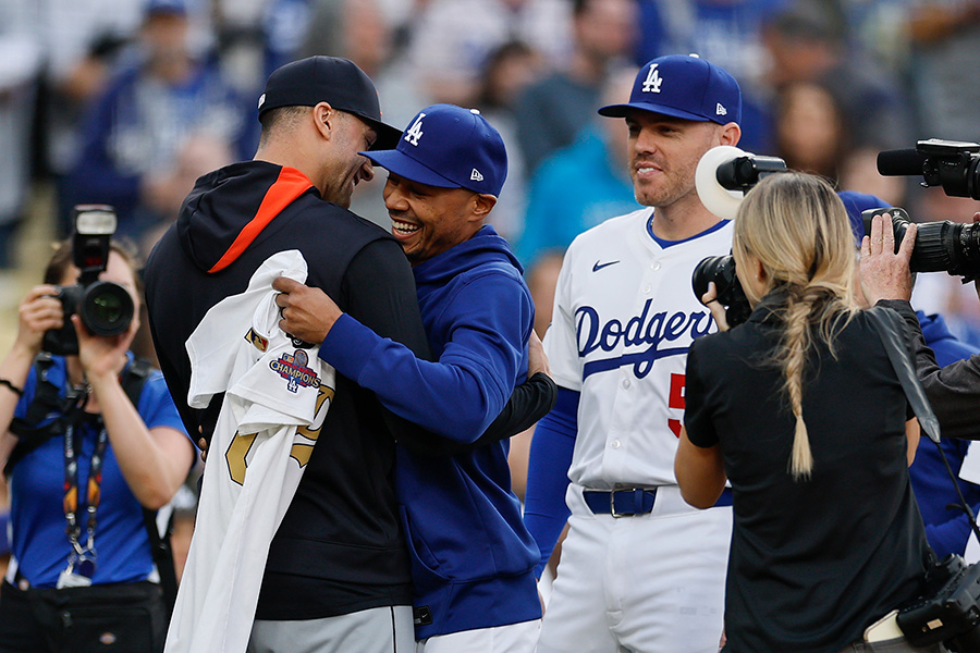 ドジャースのリング贈呈式から一夜。フラハティは前夜のタイガース先発投手だったために参加できなかったが、試合開始前に本塁後方で行われた。ムーキー・ベッツ内野手からドジャースの金色ユニホームを贈られた右腕は笑顔満開。クレイトン・カーショー、大谷翔平両投手ともハグを交わした。