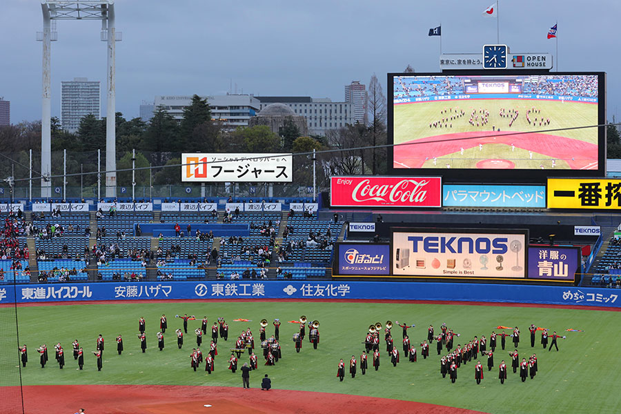 この日のセレモニーでは東海大高輪台高吹奏楽部のマーチングバンドが、演奏しながら人文字をつくるパフォーマンスを披露した。その中でヤクルトの応援ソング「We Are The Swalloows」に合わせ、つば九郎を表す「2896」がつくられた。