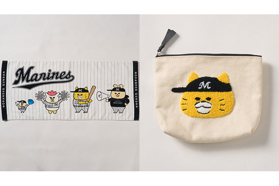 「ノラネコぐんだん」のキャラクターたちが、ロッテのユニホームを着用したイラストを新規で描き下ろしたデザインで、フェイスタオル(税込み2400円)やサガラポーチ(同2400円)、缶バッジ(同500円)など計6種のアイテムを展開。また、5月16日以降はマリーンズストア ミュージアム店でも販売される。
