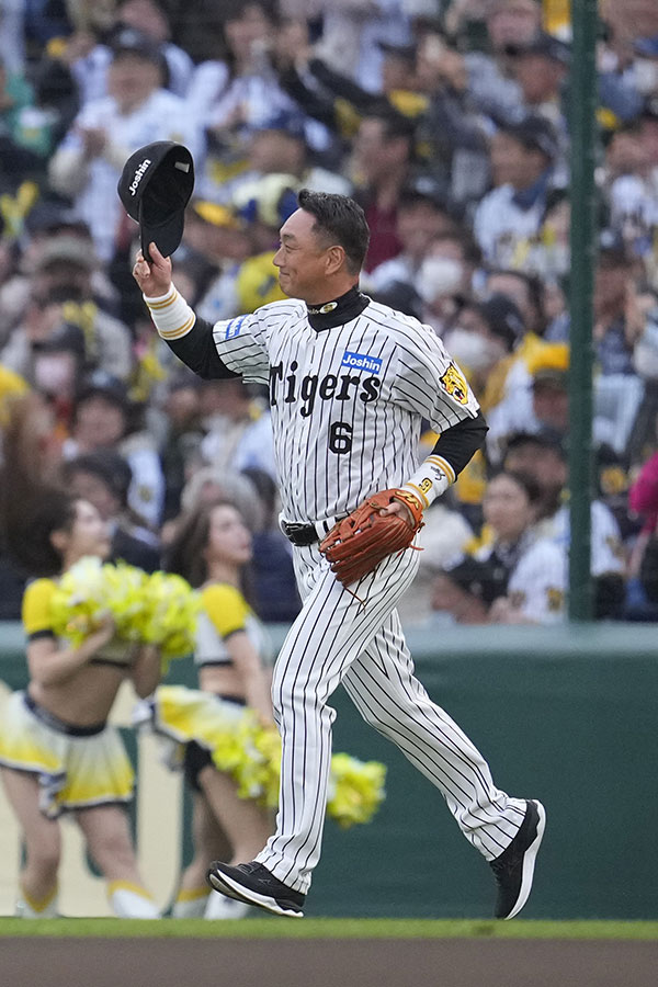 「阪神タイガース球団創設90周年記念 2025甲子園開幕戦」と銘打たれたこの日、捕手・田淵幸一氏、一塁・藤田平氏、二塁・真弓明信氏、三塁・掛布雅之氏、遊撃・鳥谷敬氏、右翼・桧山進次郎氏、中堅・赤星憲広氏、左翼・金本知憲氏がユニホーム姿で登場。それぞれ守備位置に就き、現役選手と交流も図った。