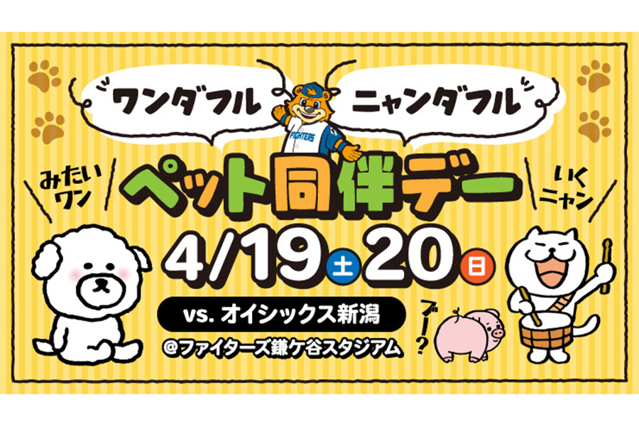 日本ハムは10日、2軍本拠地・鎌ケ谷スタジアムで行われる19、20日のイースタン・リーグ、オイシックス戦で、愛犬や愛猫と一緒に試合を観戦できる「ペット同伴デー」を開催すると発表した。