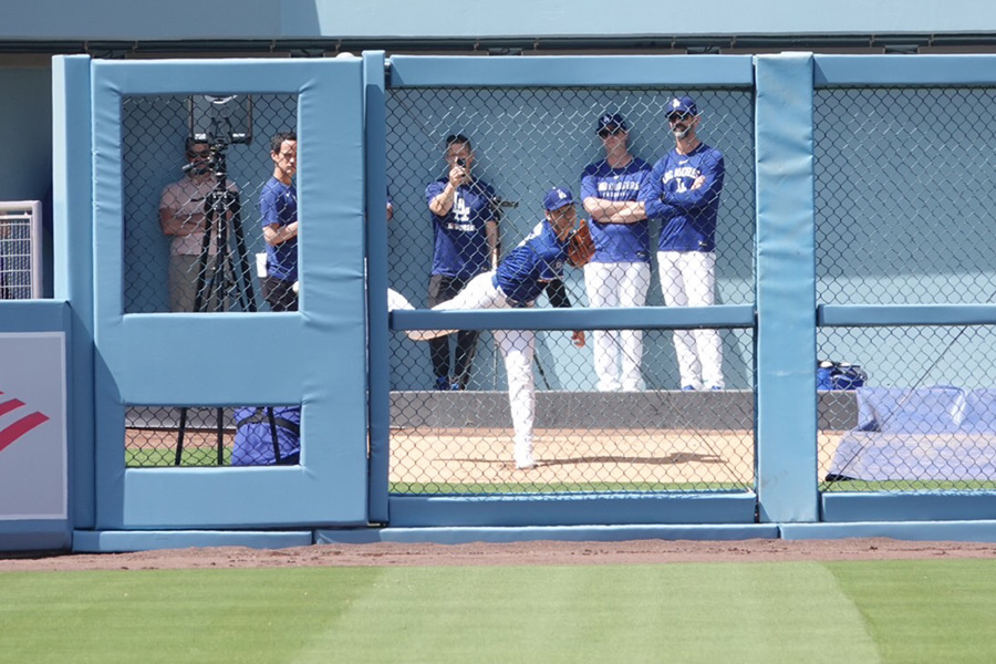 大谷のブルペン投球には同僚たちも興味深々。ゴームズGM、フリードマン編成本部長らに加えて、グラスノー、ナック、バンダらも熱視線を送っていた。