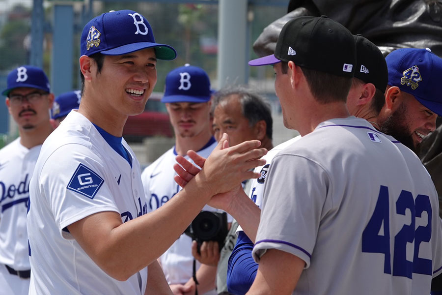 ジャッキー・ロビンソン・デーだった15日(日本時間16日)、ドジャースは本拠地・ロッキーズ戦に4-2で勝った。試合前にはセレモニーが行われ、両軍選手らがロビンソンの銅像があるセンター後方に集まった。大谷翔平投手はエンゼルス時代の同僚である右腕ジミー・ハーゲット投手とも再会し、笑顔で握手。ファンは「え! ハーゲットって今ロッキーズなの!? 知らなかった」などと声をあげた。