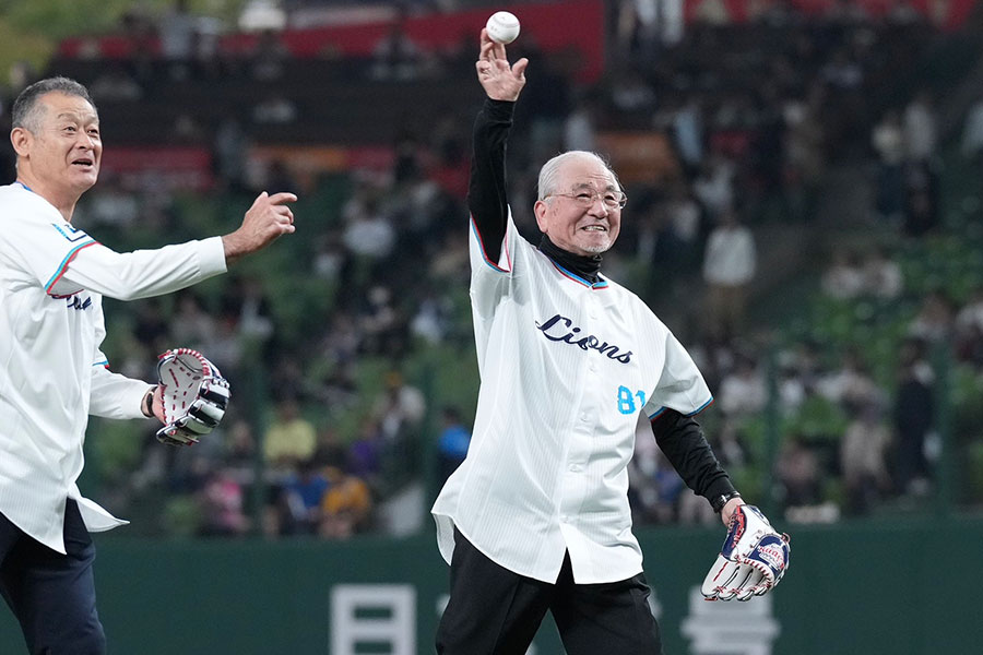 88歳の森氏だが、足取りは軽やかだった。かつて中心選手として西武黄金期を支えた石毛宏典氏、辻発彦氏、鹿取義隆氏とともにマウンド前方に並び、4人同時に投球。森氏が投じたボールはツーバウンドし、捕手役の西口文也監督のミットに収まった。