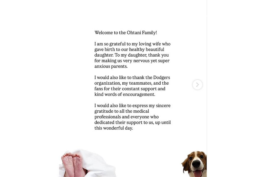 同日の試合開始とほぼ同時に、大谷がインスタグラムで発表。「健康で美しい娘を生んでくれた妻に本当に感謝しています」と喜びを報告し「そしてドジャース、同僚、そしてファンの方々からの絶え間ないサポートと温かい励ましの言葉に感謝したいと思います」と同僚らにも感謝の思いをつづっていた。