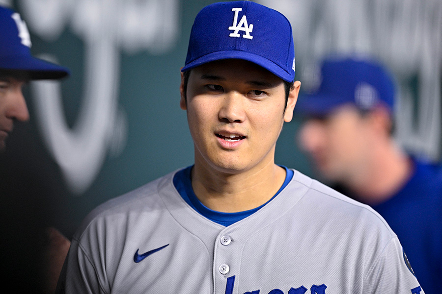 「父親リスト」から復帰2試合目となった大谷は、ブラウンのキャップを後ろ向きにかぶり、ベージュのニューバランスの長袖シャツを着用。この日先発のメイは長髪を後頭部でまとめ、サングラスを頭にかけて登場した。