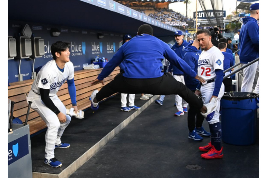 同戦では、初回に初球先頭打者アーチを放っていた大谷。試合前には、ベンチ内で選手やスタッフらとお決まりのハンドシェイクを行っており、その中でトラヴィス・スミスコンディショニングコーチは、両脚を大きく広げてジャンプ。大谷は爆笑し、ミゲル・ロハス内野手もニヤりと見つめている。