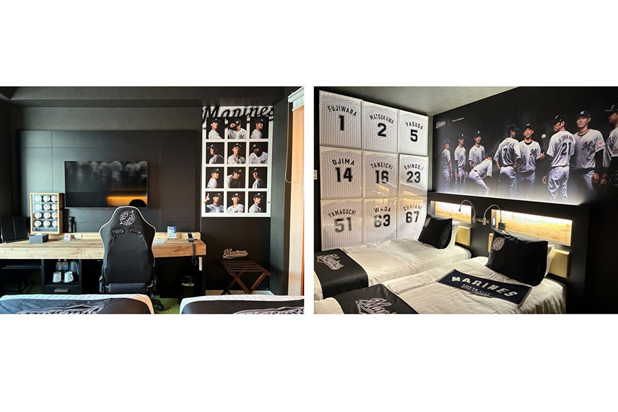 ロッテは2日、ロッテシティホテル錦糸町とのコラボレーションルームである「マリーンズルーム」の内装がリニューアルされたと発表した。部屋全体のテイストはマリーンズのチームカラーであるブラックとホワイトを基調とし、部屋一面に敷かれたグリーンのカーペットはまるでZOZOマリンスタジアムに入場したかのような高揚感を感じることができる。