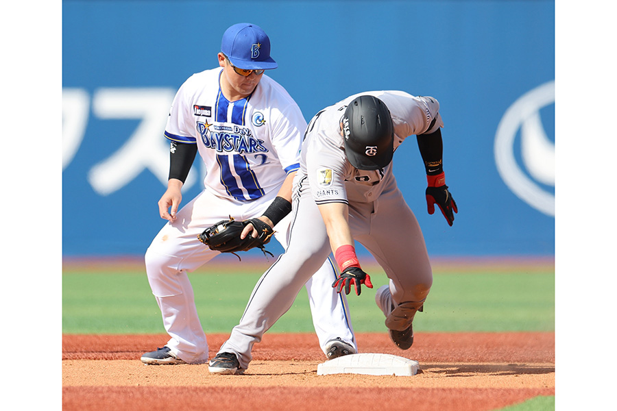 巨人の岡本和真内野手は3日、横浜スタジアムで行われたDeNA戦で安打を放って二塁を狙ったが、スライディングした際にベースをわずかに離れてしまいタッチアウトとなった。