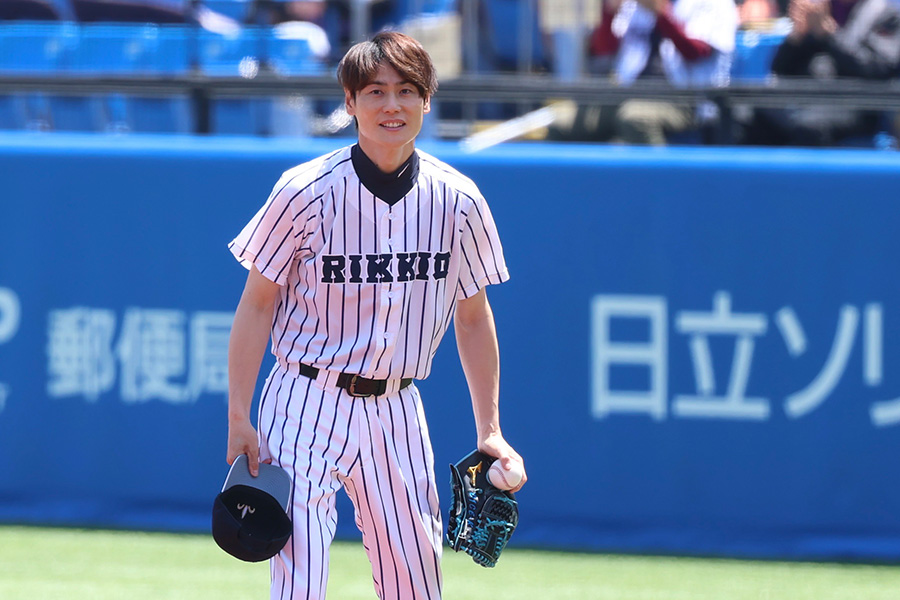 立大のユニホーム姿でマウンドに上がった上重氏は、ダイナミックなフォームでボールを投じるも、捕手の手前でワンバウンド。「打者に当ててはいけないという気持ちが強すぎて、叩きつけてしまいました」と頭をかきつつ、「神宮のマウンドは大学卒業以来23年ぶり。懐かしさとともに、緊張と興奮がよみがえってきました」とトレードマークのさわやかな笑顔を浮かべた。