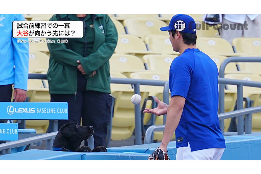 ドジャース・大谷翔平投手の“犬愛”が溢れ出す――。16日(日本時間17日)、本拠地でのエンゼルス戦の試合前練習でのこと。キャッチボールをしようと外野に向かって歩いていると、遠くに聞こえる「ワンッ!」の声に即反応。球場の警備犬・イーグルくんを見つけると、体をわしゃわしゃ触りながらニッコリ。さらには粋なプレゼントも……。自身の愛犬・デコピンだけでなく、犬好きが炸裂。少年のような大谷選手の一部始終を映像で追いました。