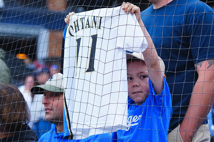 根っからの“大谷ファン”が発見された。ドジャースの大谷翔平投手は5月28日(日本時間29日)、敵地でのガーディアンズ戦に「1番・指名打者」で出場。米スポーツ局「MLBネットワーク」の公式インスタグラムや公式X(旧ツイッター)では「オオタニがグラウンドで投球する間、若いファンが彼に日本ハムファイターズ時代のをユニホーム見せていた」と、日本ハム時代のユニホームを掲げる少年が紹介されていた。