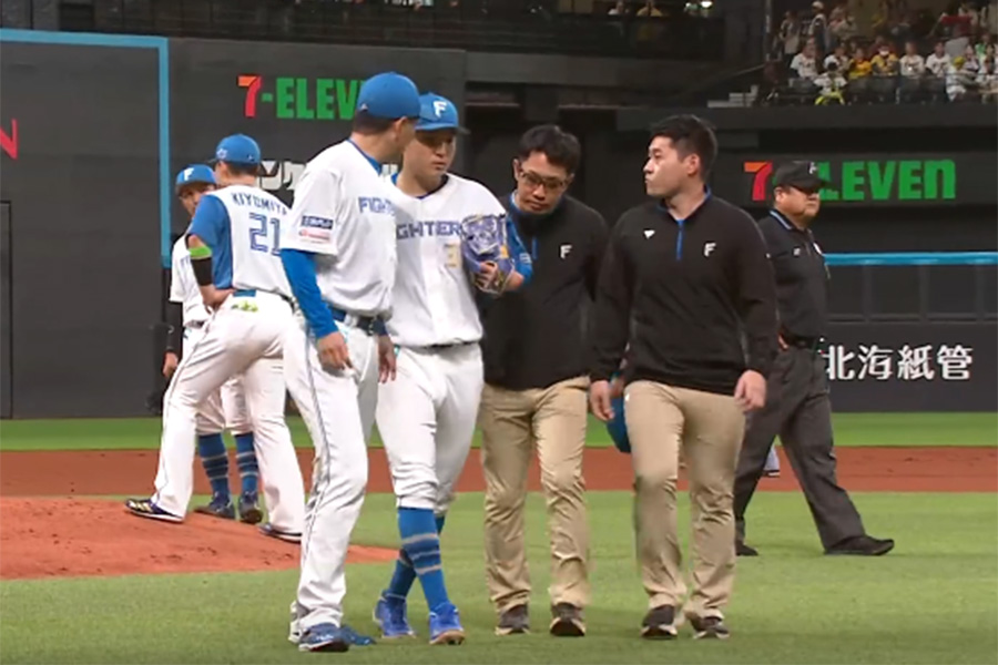 3回2死二塁から中野に初球を投じた後、トレーナーらに付き添われベンチへ