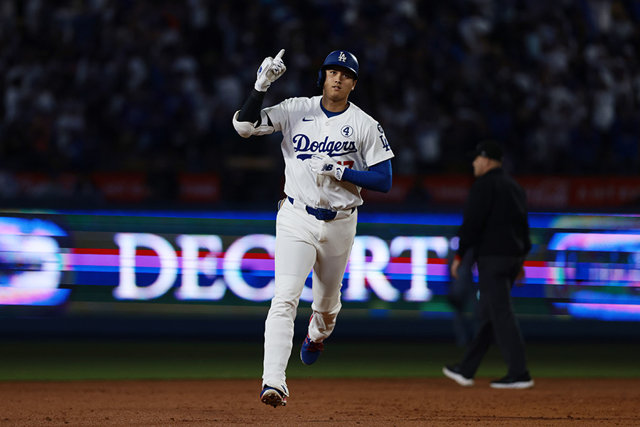 LAの夜空に号砲をかけた。0-2の7回2死で迎えた第4打席、クラニックの初球のカーブを強振。打球初速113.9マイル(約183.3キロ)、飛距離424フィート(約129.2メートル)、角度38度の一発を右翼席に叩き込んだ。大谷は打った瞬間に確信したのか、何度もうなずきながらダイヤモンドを一周した。