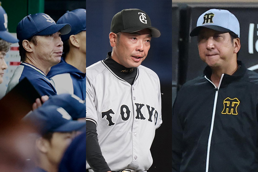 ヤクルト・高津臣吾監督、巨人・阿部慎之助監督、阪神・藤川球児監督(左から)【写真:小池義弘、産経新聞社】