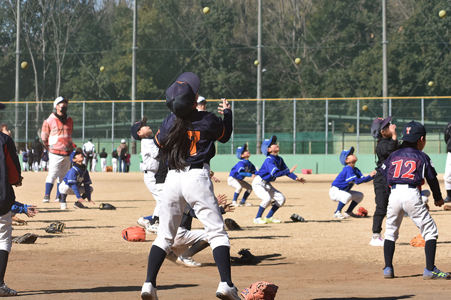 取材日には指導者約30人と低学年選手87人が集まり、「投げる・打つ・捕る」に分かれて指導が行われた。「捕る」を担当した倉俣さんは、まずボールを右手から左手・左手から右手に素早く持ち替えたり、体の周りをグルグルと回したりするコーディネーショントレーニング(ボールハンドリング)を実施。そこから2人1組になり、キャッチボールに至るまで、まず3段階に分けての捕球メニューを行った。
