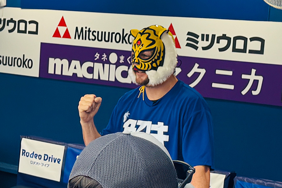 この日、4代目タイガーマスクが来場。現役で活躍する覆面レスラーから“愛用マスク”を譲り受けると、報道陣が見守る前でポーズを決めてカメラに収まった。笑顔で珍パフォーマンスを行った助っ人右腕に、一塁側ベンチは和やかなムードに包まれた。