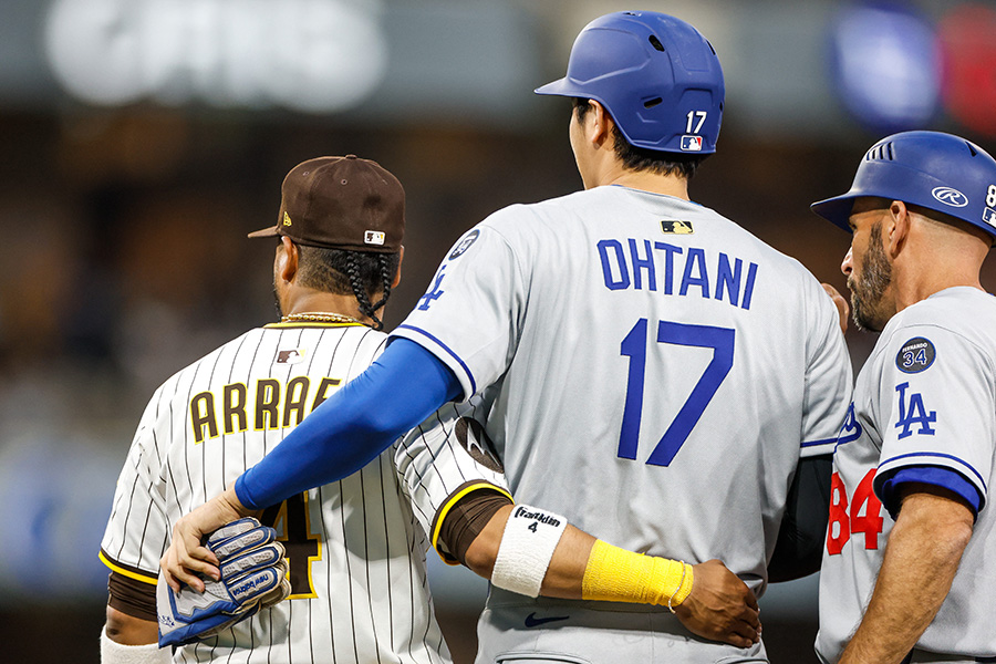ドジャースの大谷翔平投手は9日(日本時間10日)、敵地でのパドレス戦に「1番・指名打者」で出場。5打数1安打1四球で勝利に貢献した。首位攻防戦でピリピリとした空気が漂う中、大谷が塁上で“ライバル”と微笑ましい関係を築いていたようだ。
