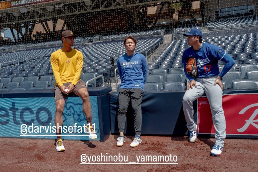 ドジャース・大谷翔平投手は10日(日本時間11日)、ライブBP登板直後にパドレス・ダルビッシュ有投手、同僚の山本由伸投手と談笑した。