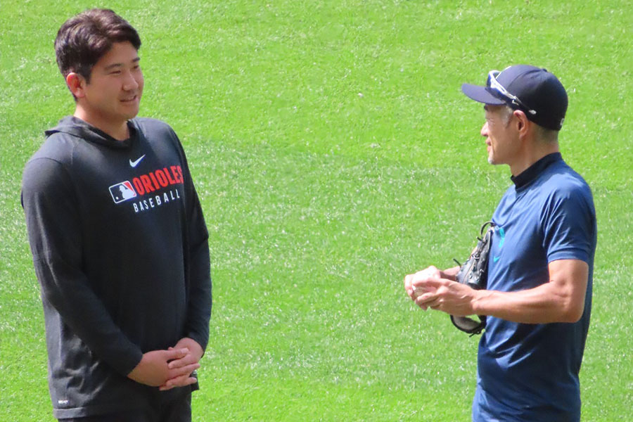 オリオールズの菅野智之投手は14日(日本時間15日)、ボルチモアでのエンゼルス戦に先発。地元ファンの前で快投は披露できず6勝目はならなかったが、初回に主砲マイク・トラウトに2ランを浴びるも、その後は持ち前の粘投を続け降板する5回途中までを4安打1失点で持ち堪えた。「苦しいときでも試合を作る」の強い信念を胸に秘める菅野は、シアトルで初対面した憧れのイチロー氏と談笑し、投球の本質に通じる大事な側面を再認識した。単独取材で明かしたその“本質”とは――。【全4回の2回目】(取材・構成=木崎英夫)