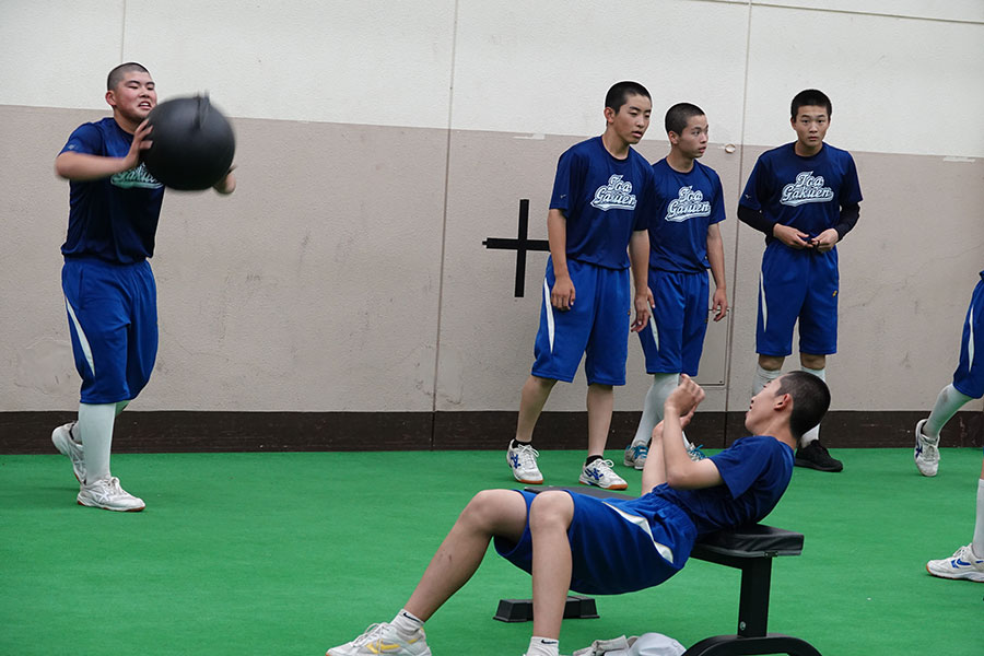 体育館の地下には人工芝が敷かれ、バッティング練習もできる立派な室内練習場があります。行われているウエイトも外部コーチの専門家の指導のもと、部員ごとにメニューが異なります。定期的に測定日を設けて、それぞれに結果のチャート表が作成され、項目ごとの成長や課題を可視化しているそうです。実際にグラフで弱いところ、強いところがしっかりとわかるようになっていました。