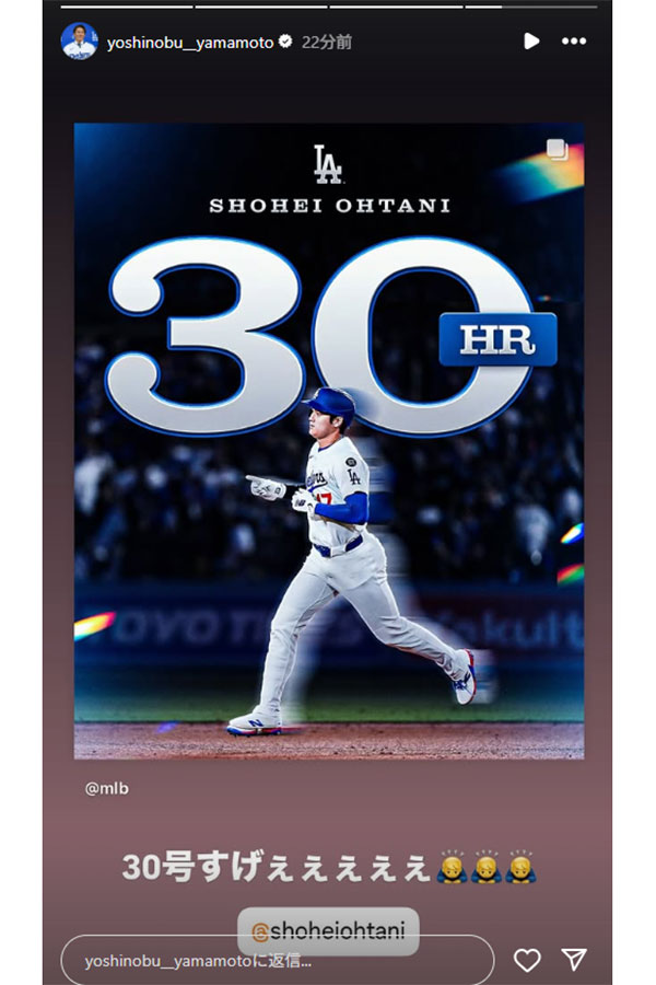 試合後には自身のインスタグラムを更新。投球映像などを引用する中、大谷の大台突破を祝福した。大谷のインスタグラムをメンションし、「30号すげぇぇぇぇ」と綴り、謝るような絵文字も3つ添えた。