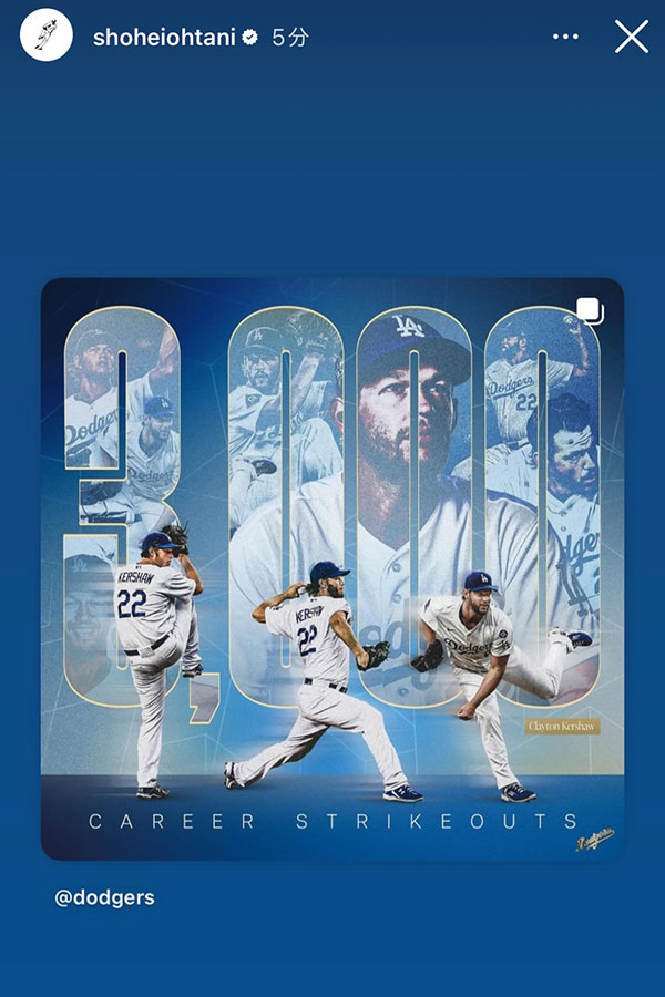 ドジャースの大谷翔平投手は2日(日本時間3日)、自身のインスタグラムのストーリーズ機能を更新。史上20人目となる通算3000奪三振を達成したクレイトン・カーショー投手を祝福した。