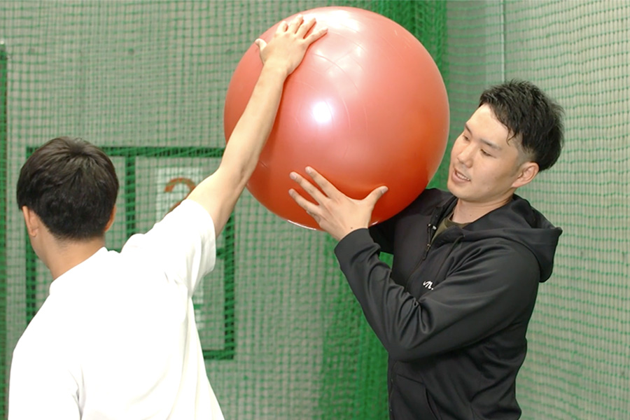 やり方は、パートナーにバランスボールを持ってリリースの場所に固定してもらい、テークバックして叩くだけ。この動きを連続して10回ほど行う。注意したいのは、バランスボールの位置。捕手側に置きすぎると、肘が出てしまう。また、ボールを叩く際に体が横方向に流れないように気を付けたい。