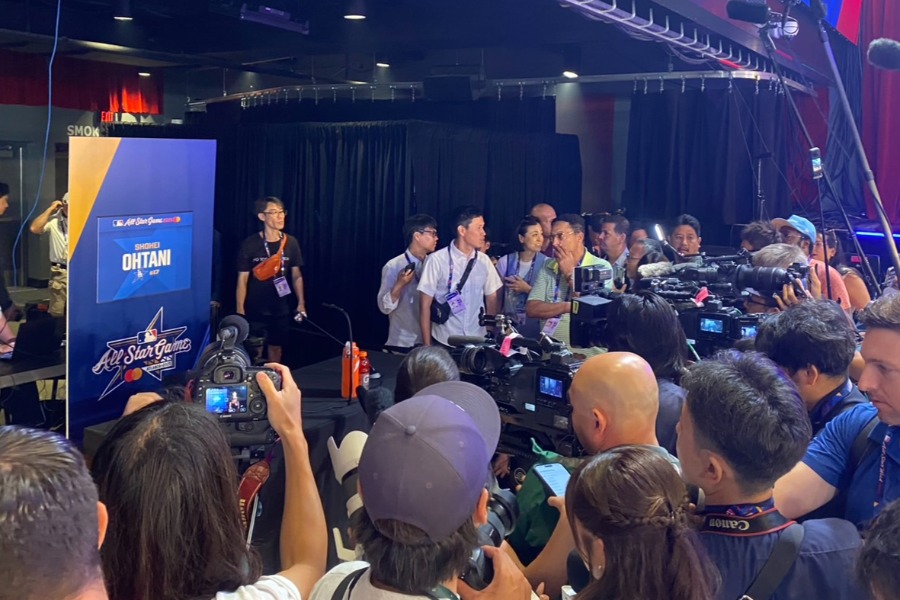 ドジャース・大谷翔平投手は14日(日本時間15日)に米ジョージア州アトランタで行われたオールスター前日会見に臨んだ。会見前から取材ブースには日米メディアが殺到。7台以上のテレビカメラが取り囲む注目ぶりだったが、あまりの報道陣の多さに一時はメディアが追い出される事態となった。