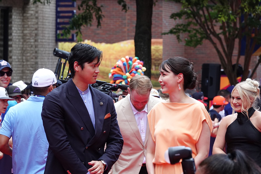 この日、大谷はネイビーのスーツ、真美子夫人は淡いオレンジのドレスで登場。MLBネットワークのインタビューで美子夫人のドレスについて「多分、ピーチの色で妻が選んだと思う。何個か選択肢があって、その中から僕が選びました」と説明していた。