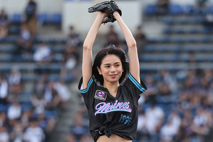 幕張の風に髪をなびかせ、へそ出しの黒いユニホームでマウンドに上がった佐藤さん。173センチのスラリとした体型から、大きく振りかぶって投げた1球は、惜しくもミット手前でショートバウンドとなったものの、捕手が構えた位置にほぼ正確に届く見事なコントロールを披露。はにかんだように髪をかき上げ、笑顔を見せていた。
