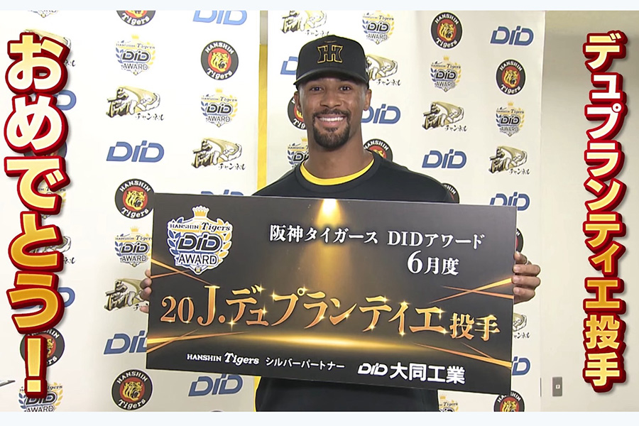 6月19日のロッテ戦で12三振を奪う来日初完封で、6月度の「DID 大同工業 presents 阪神タイガース DIDアワード」に選ばれたジョン・デュプランティエ投手が、授賞式で「阪神ファンは野球界で最高です。私は甲子園でプレーするのが大好きです」と喜びを語った。