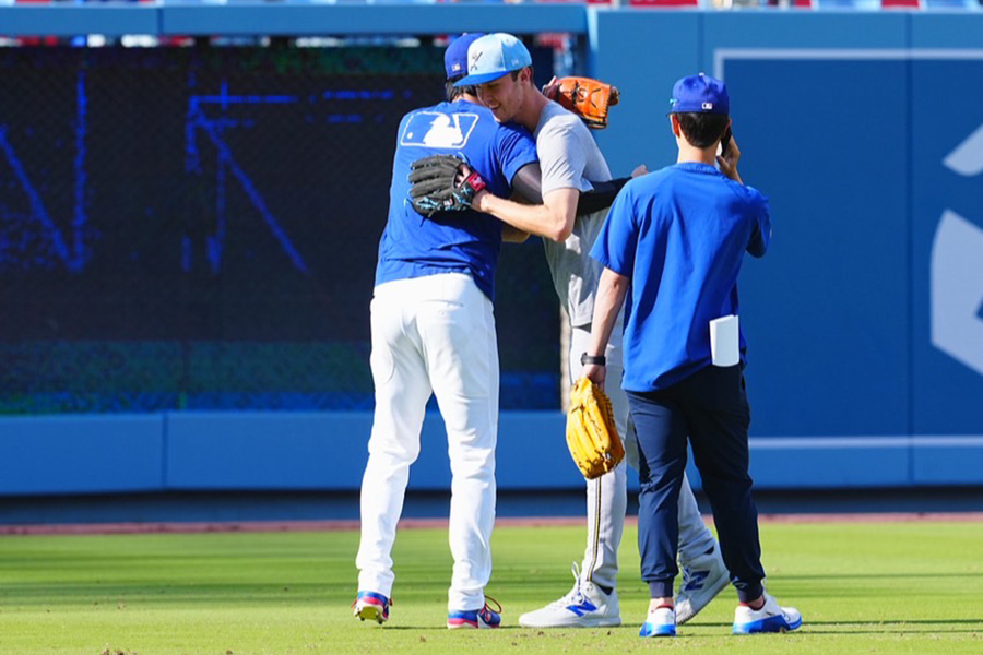 グラウンドに広がった“再会シーン”に注目するファンが続出した。ドジャース・大谷翔平投手は18日(日本時間19日)、本拠地でのブルワーズ戦の試合前、ジェイコブ・ミジオロウスキー投手と再会。15日(同16日)のオールスターにも出場した2人の交流に「素敵です」「おーすげー!」とファンも喜んでいる。