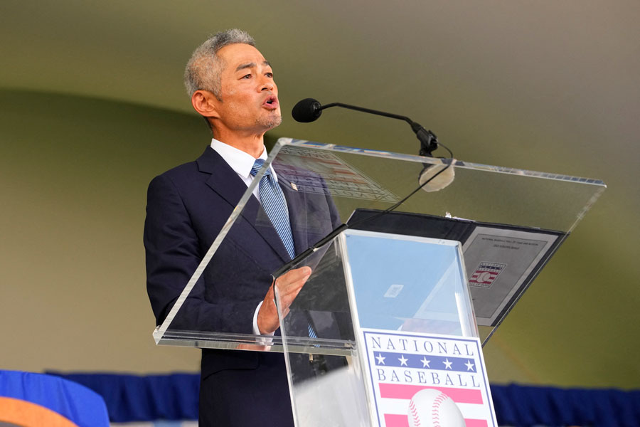 アジア選手として初の米野球殿堂入りを果たしたイチロー氏(マリナーズ会長付特別補佐兼インストラクター)が27日(日本時間28日)、ニューヨーク州クーパーズタウンで表彰式典に出席。19分間にわたり英語でスピーチを行った。スピーチを終えると「最も力になってくれたのは妻の弓子です」と成功の影に愛妻の存在があったことを明かした。