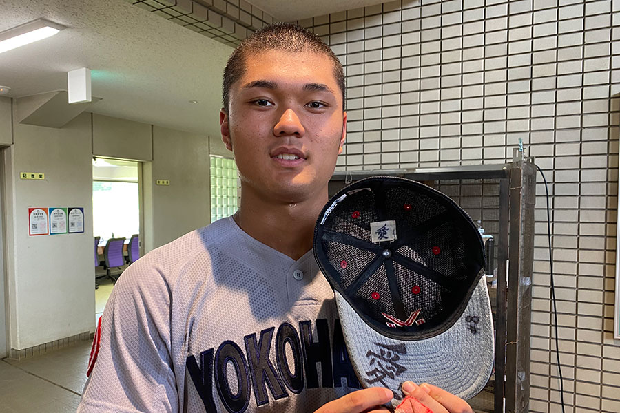 シンプルな一文字だ。じつは、「愛」と書くのは二度目のこと。センバツ前にも書いたが、大きくきれいに書く自信がなく、帽子のてっぺんにあるタグ部分に小さく控えめに書き入れた。