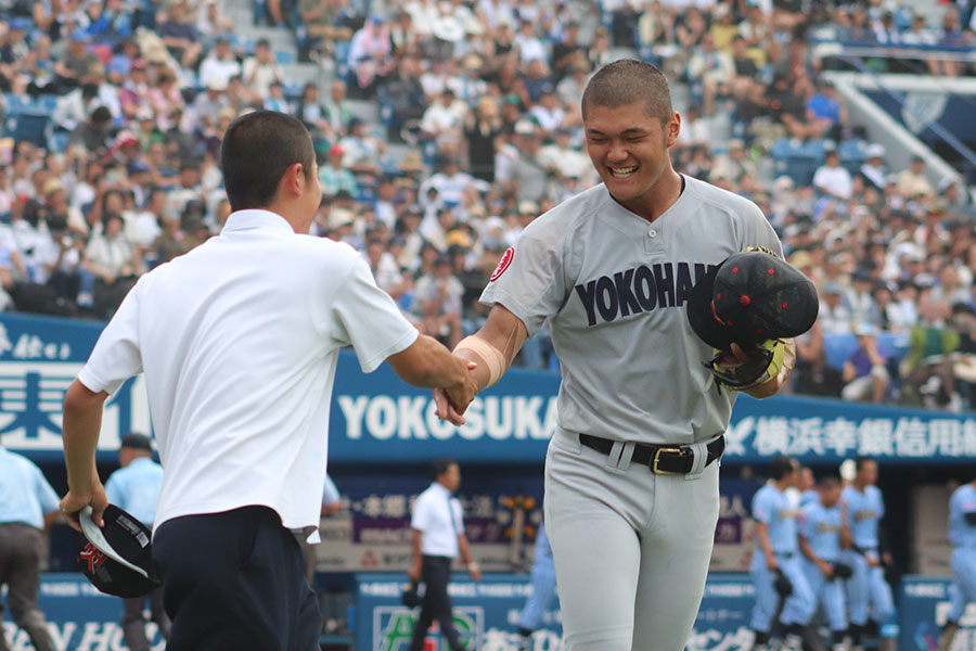 阿部には勝利後のルーティンがある。校歌のあと応援席に向かいながら、林田大翼マネージャーと握手をする。決勝で東海大相模を下したあとも、2人は満面の笑みで握手を交わした。間違いなく、この夏一番の笑顔だった。