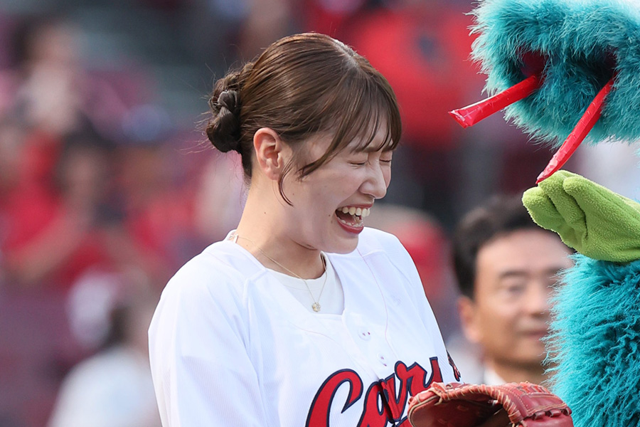 この日、背番号「80」のカープホームユニを着用し、お団子ヘアに白いパンツで登場。ワインドアップから投球すると、本拠地も拍手が沸き起こった。