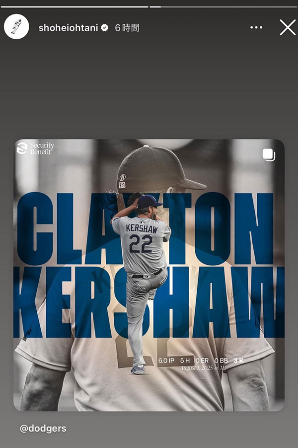 試合終了22分後…大谷翔平が称えた“投打のヒーロー” SNSで表した同僚への敬意 大谷翔平 2025.08.02 【実際の投稿】自身のマルチ安打よりも…大谷翔平が勝利後にファンに伝えた同僚の活躍 【実際の投稿】自身のマルチ安打よりも…大谷翔平が勝利後にファンに伝えた同僚の活躍(画像はスクリーンショット) (Full-Count編集部) この画像の記事を読む 1 2 RECOMMEND オススメ記事 KEYWORD 注目のタグ #ドジャース #エンゼルス #アーロン・ジャッジ #デーブ・ロバーツ #パドレス #カブス #マイク・トラウト #フェルナンド・タティスJr. #マリナーズ #フアン・ソト #ヤンキース #レッドソックス #ジェイコブ・デグロム #ブルージェイズ #アンソニー・レンドン CATEGORY 関連カテゴリ一 日本人選手 ダルビッシュ有 イチロー MLB総合 大谷翔平 前田健太 菊池雄星 鈴木誠也 菅野智之 山本由伸 吉田正尚 佐々木朗希 千賀滉大 今永昇太 松井裕樹 小笠原慎之介