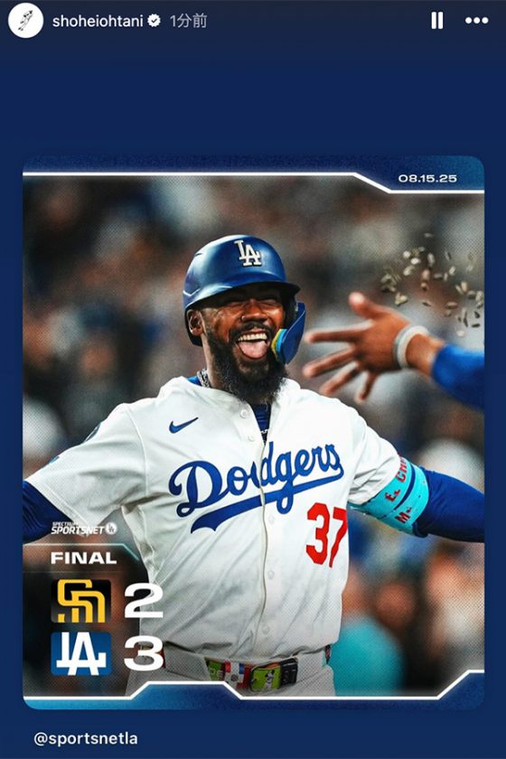 大谷翔平、激闘勝利後に“真っ先”に称えた2人のヒーロー 忘れぬ同僚への敬意 大谷翔平 2025.08.16 【実際の投稿】大谷翔平がストーリーズに投稿 首位再浮上に貢献した投打のヒーロー 【実際の投稿】大谷翔平がストーリーズに投稿 首位再浮上に貢献した投打のヒーロー(投稿をスクリーンショット) (Full-Count編集部) この画像の記事を読む
