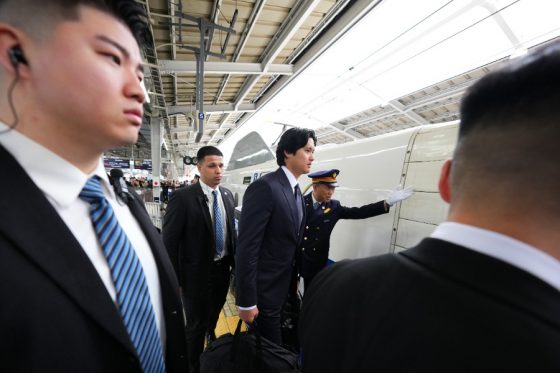 新大阪で「VIP」な大谷翔平 複数のSPが“トライアングル”…黒スーツで放つ存在感 侍ジャパン 2026.03.04 【実際の様子】厳戒態勢のなか新幹線のホームに登場…屈強な4人に囲まれる大谷翔平 厳戒態勢のなか新幹線のホームに登場…屈強な4人に囲まれる大谷翔平【写真:Getty Images】 (Full-Count編集部) この画像の記事を読む 1 2 RECOMMEND オススメ記事