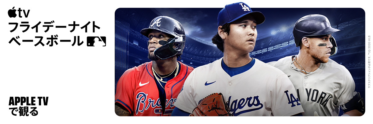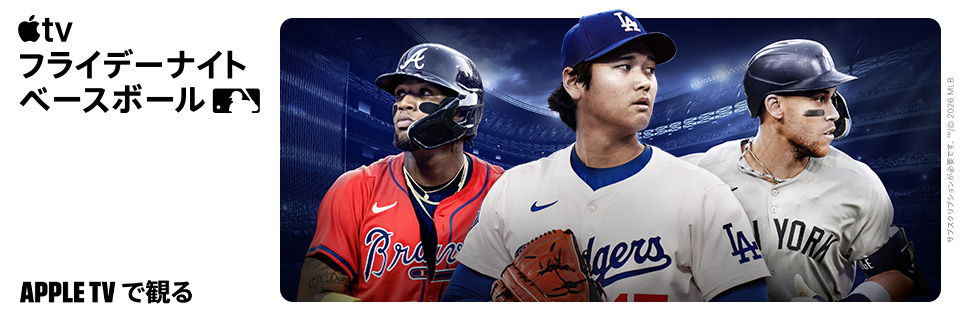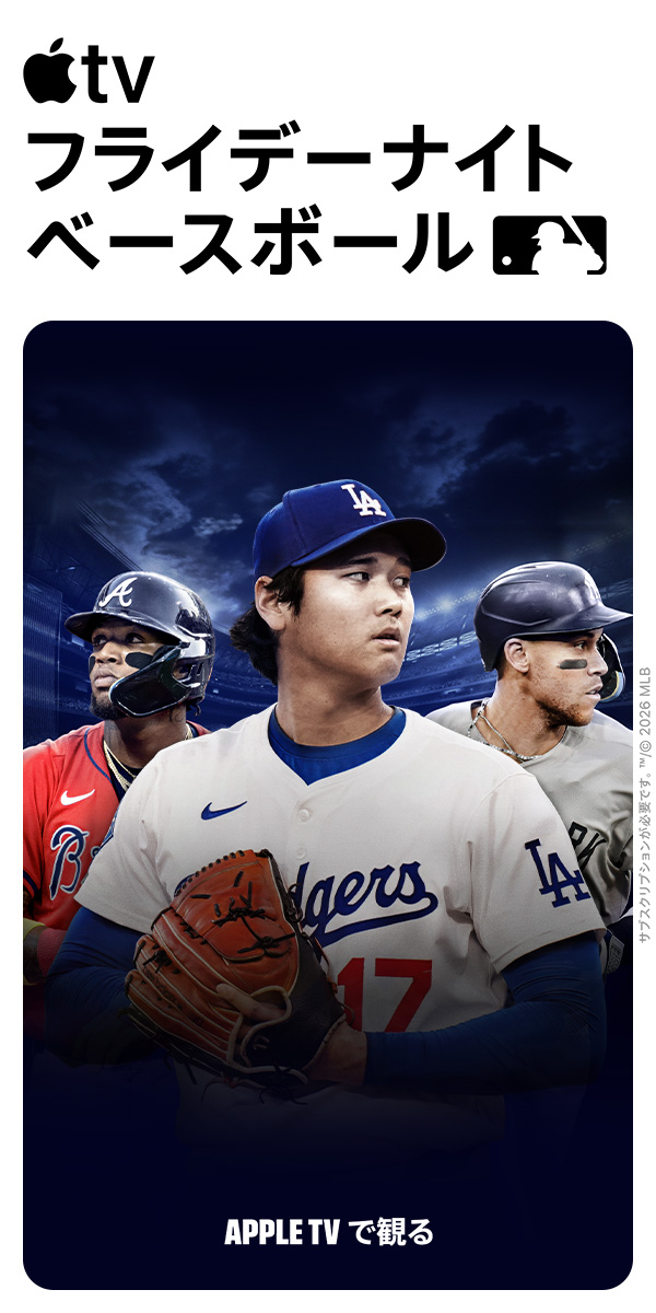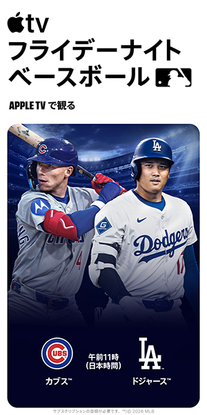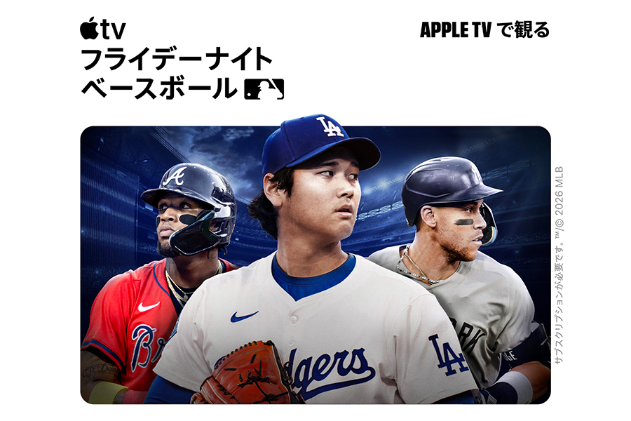 Apple TVでは、今シーズンも3月27日(同28日)より「フライデーナイト ベースボール」で注目カードを生配信する。現地金曜日に実施される試合のうち、2試合をダブルヘッダー形式でオンエア。日本時間では土曜日の朝、地域の放送制約にとらわれることなく、現地の興奮をそのままにお届けする。