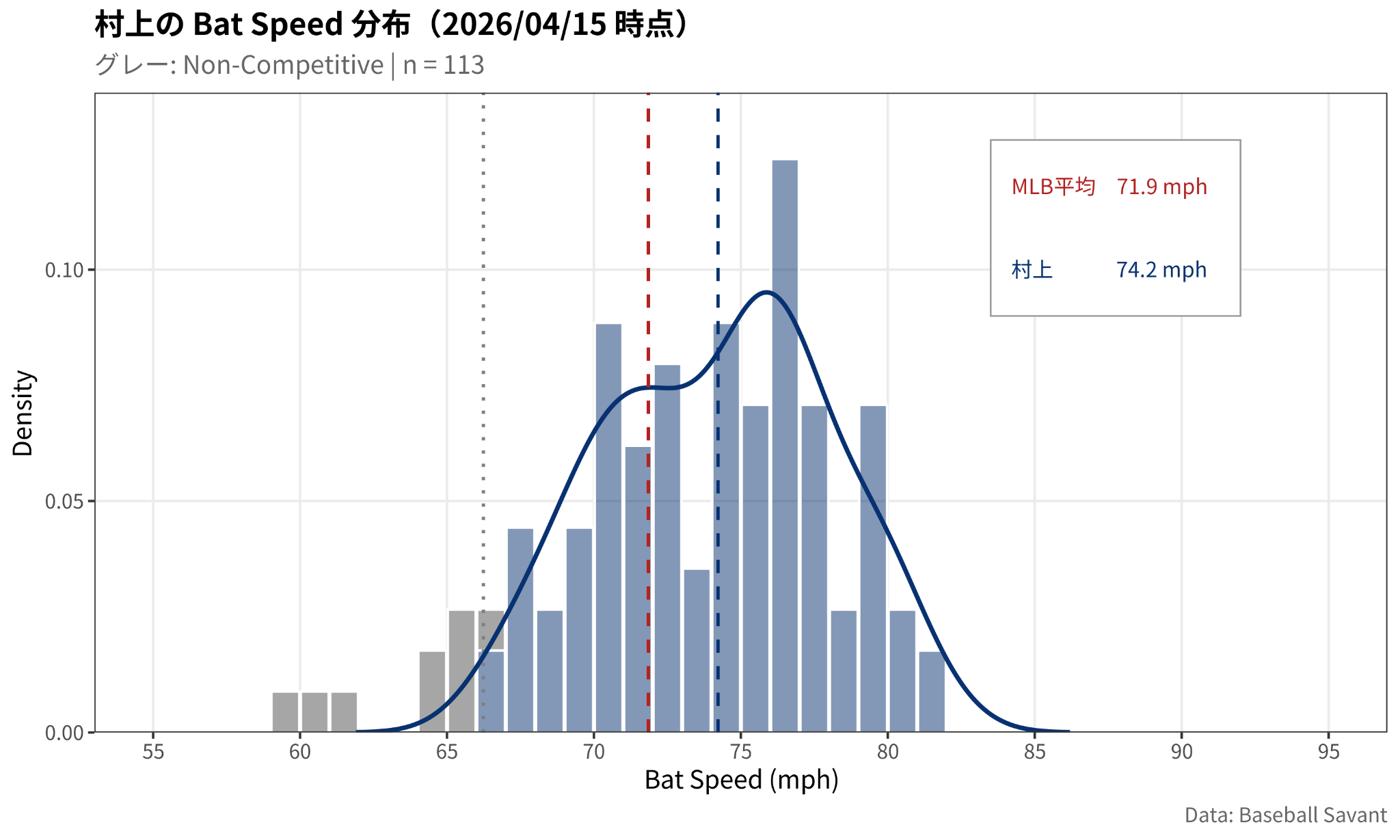ちなみに、シーズン序盤の小さいサンプルサイズで二峰性の分布を示す打者は、シーズンが進むにつれ高い方の峰に寄りやすい傾向があるという。村上の分布で、右側の山は76~77マイル(約122.3~123.9キロ)。