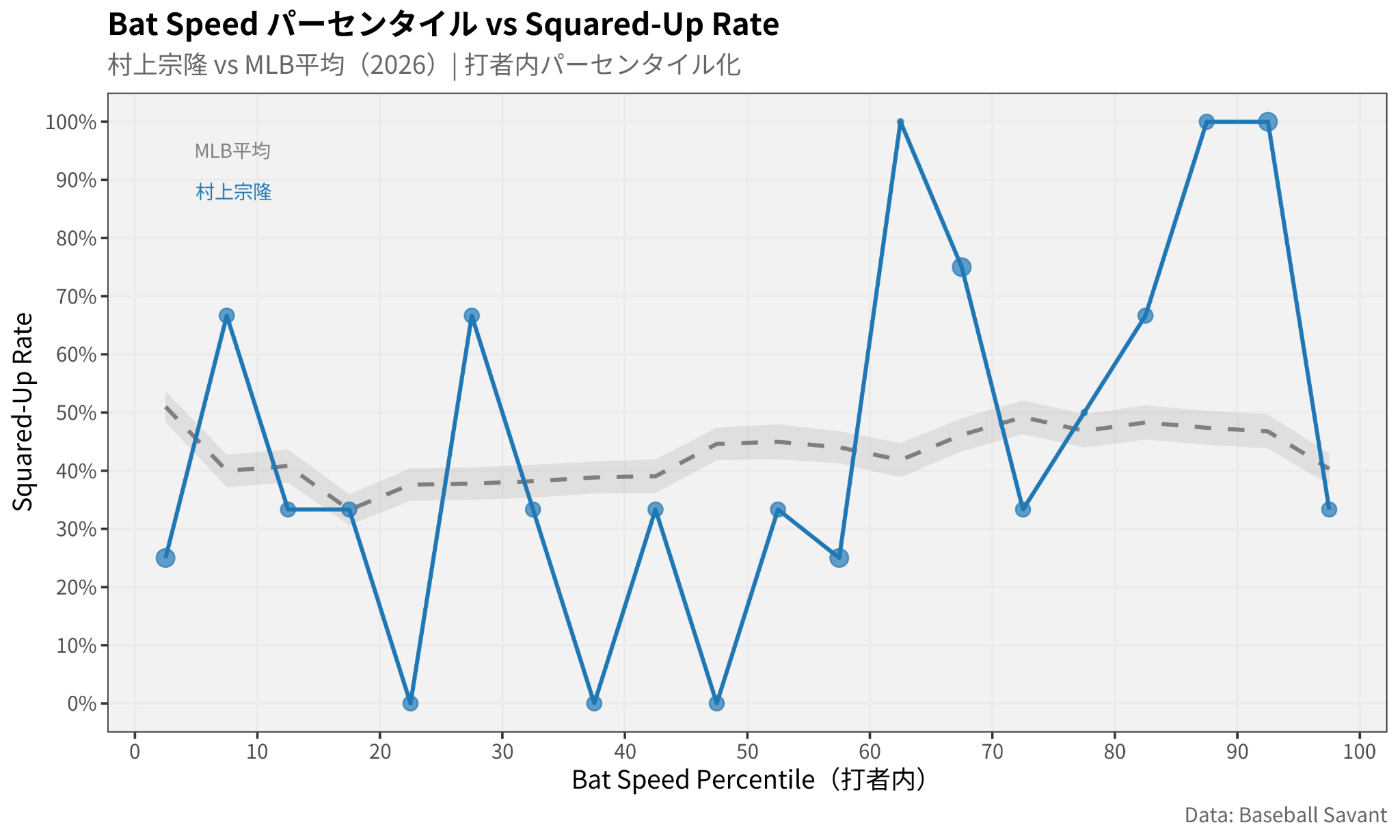さらに、まだ様子見の段階ではあるものの、村上は自身のスイングができた時とできていない時のSquared Up Rate(バットスピードと球速から期待される理想の打球速度に対する効率≒バットの芯近くで捉えたかを測る指標)が他選手と比較するとはっきりしている。強く振れていない時は、芯にも当たっていないのである。