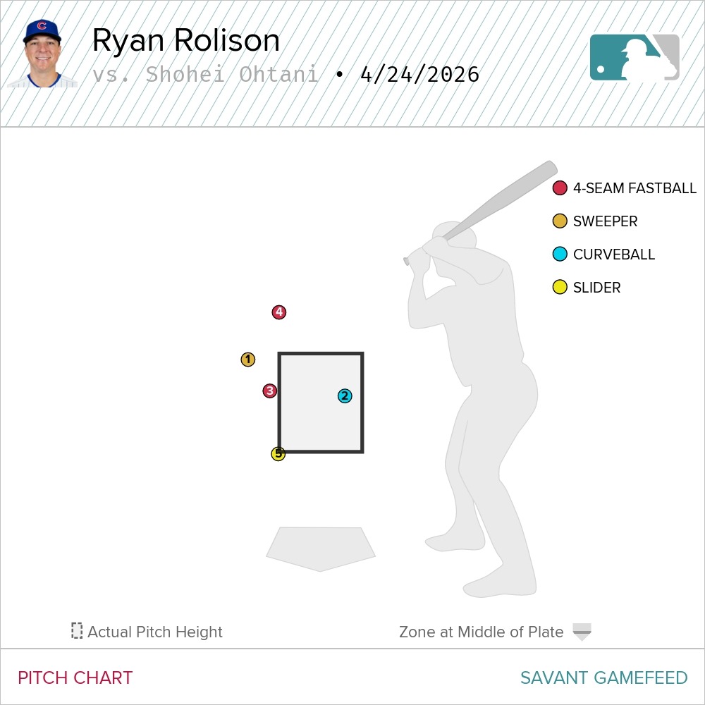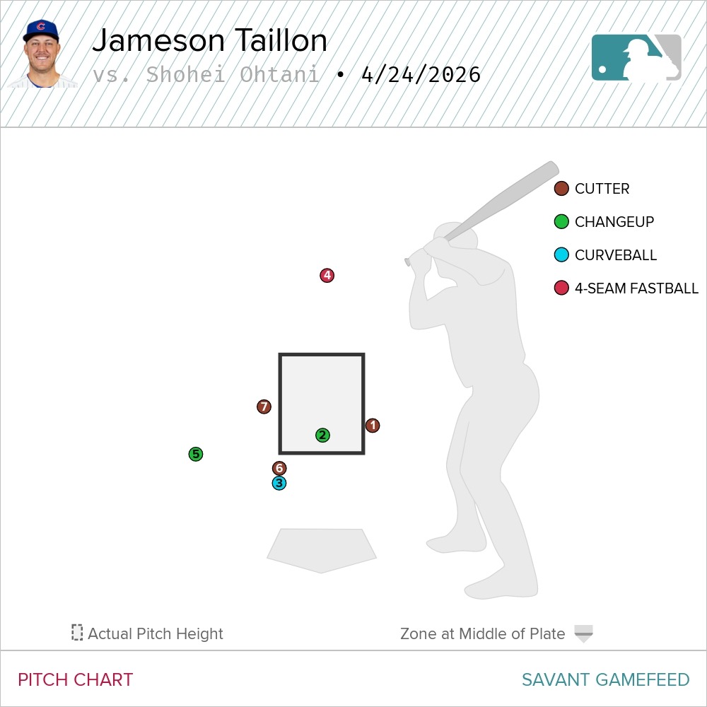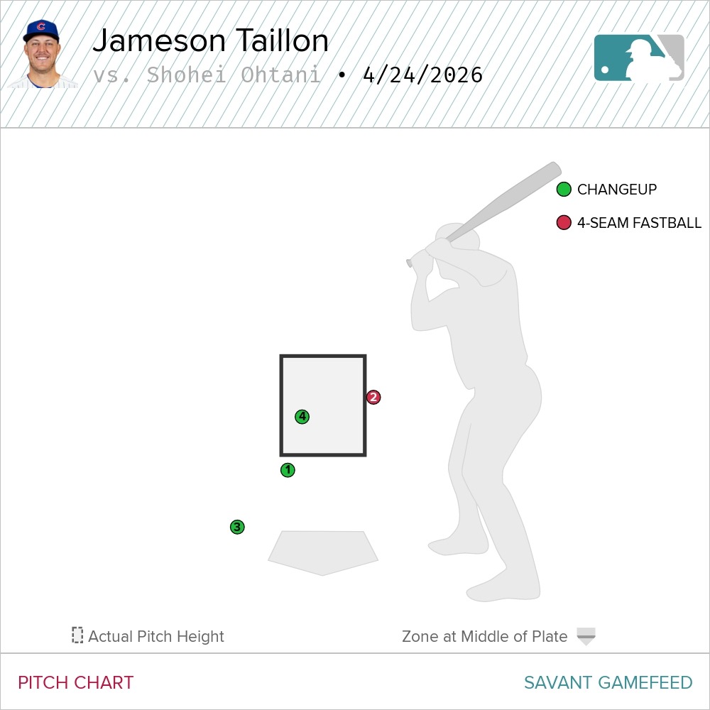 初回先頭。野口氏が事前に描いていた基本戦略通り、カブス先発の右腕ジェームソン・タイヨン投手とカーソン・ケリー捕手のバッテリーは、全6球を外角に集めた。