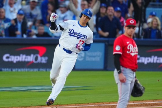 ドジャース・大谷翔平投手は30日(日本時間10月1日)、本拠地で行われたレッズとのワイルドカードシリーズ(WCS)第1戦に「1番・指名打者」で出場し、初回の第1打席で本塁打…